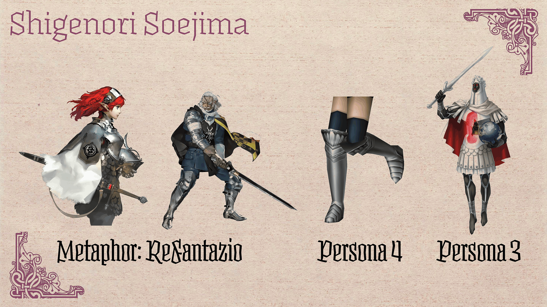 The first is Shigenori Soejima, a Japanese character artist best known for his work in video game concept art. The way he designs fantasy armor was a huge inspiration for me.